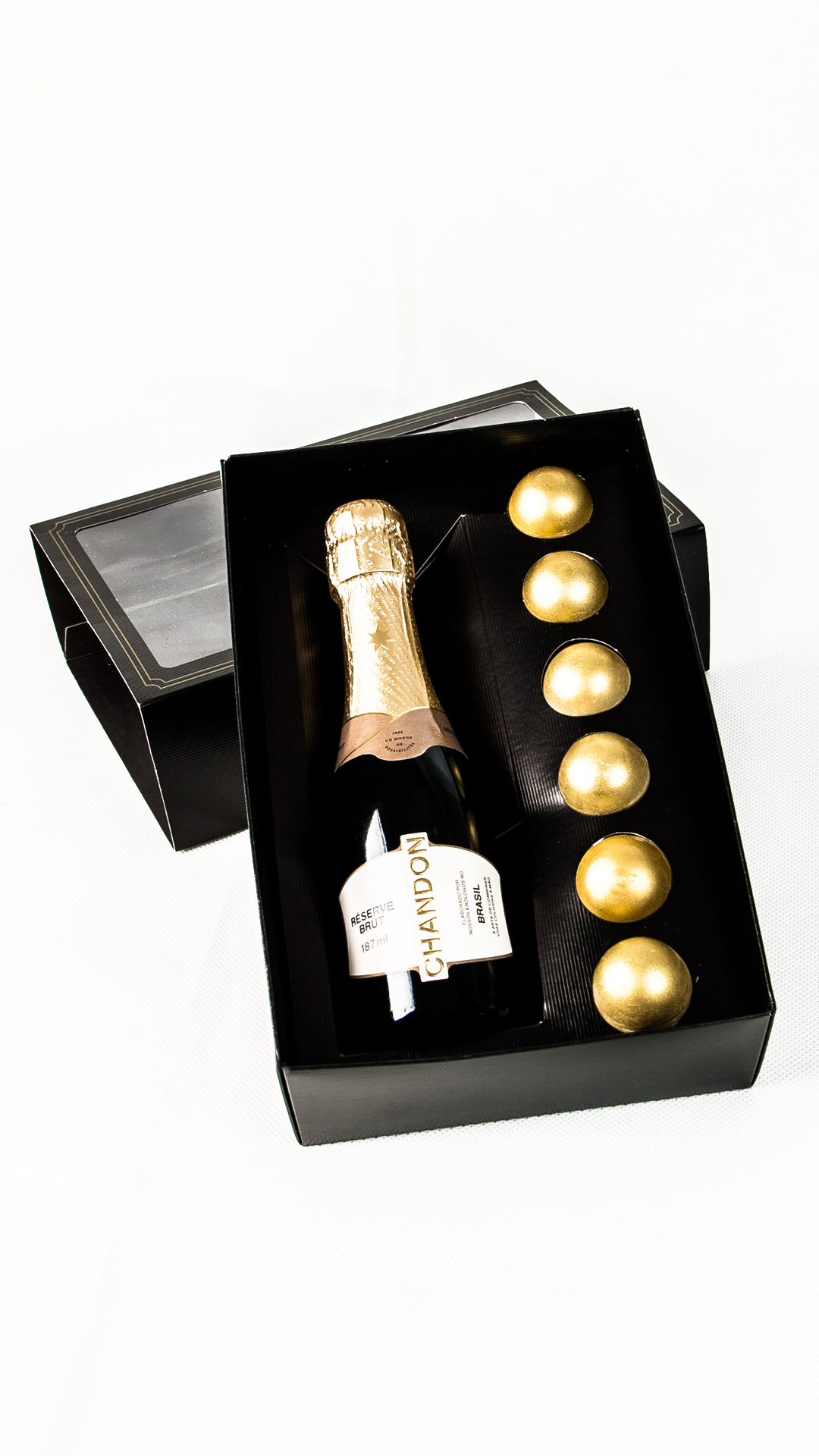 Brinde com brilho e elegância: Chandon Réserve Brut mini e bombons de brigadeiro belga gourmet em uma caixa exclusiva.